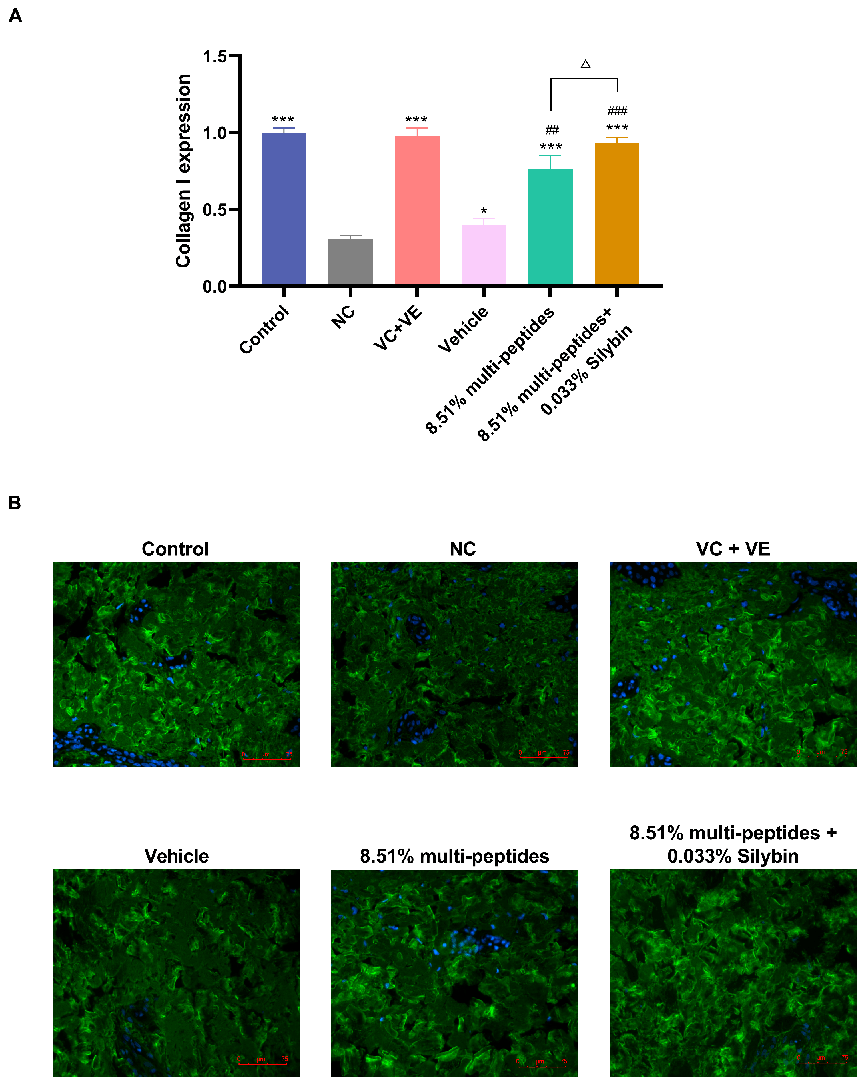 Figure 3. Effect of 8.51% multi-peptides and 8.51% multi-peptides + 0.033% silybin on UV-induced reduction of collagen I in human skin explants. (A) Semiquantitative analysis of collagen I expression in different groups, with IOD used to represent the level of expression. (B) Representative immunofluorescence (IF) images of collagen I (green) and nucleus (blue, DAPI). Higher green fluorescence indicates higher collagen I expression. Experimental groups: untreated group (control), UV-induced only (negative control, NC), positive control (VC + VE), minimalist formula (vehicle), 8.51% multi-peptides, and 8.51% multi-peptides + 0.033% Silybin. Data are presented as mean ± SD (n = 3). Statistical analysis was performed using Student’s t-test in each group. Statistical significance: * p < 0.05, *** p < 0.001 vs. NC; ## p < 0.01, ### p < 0.001 vs. vehicle; Δ p < 0.05 vs. multi-peptides.