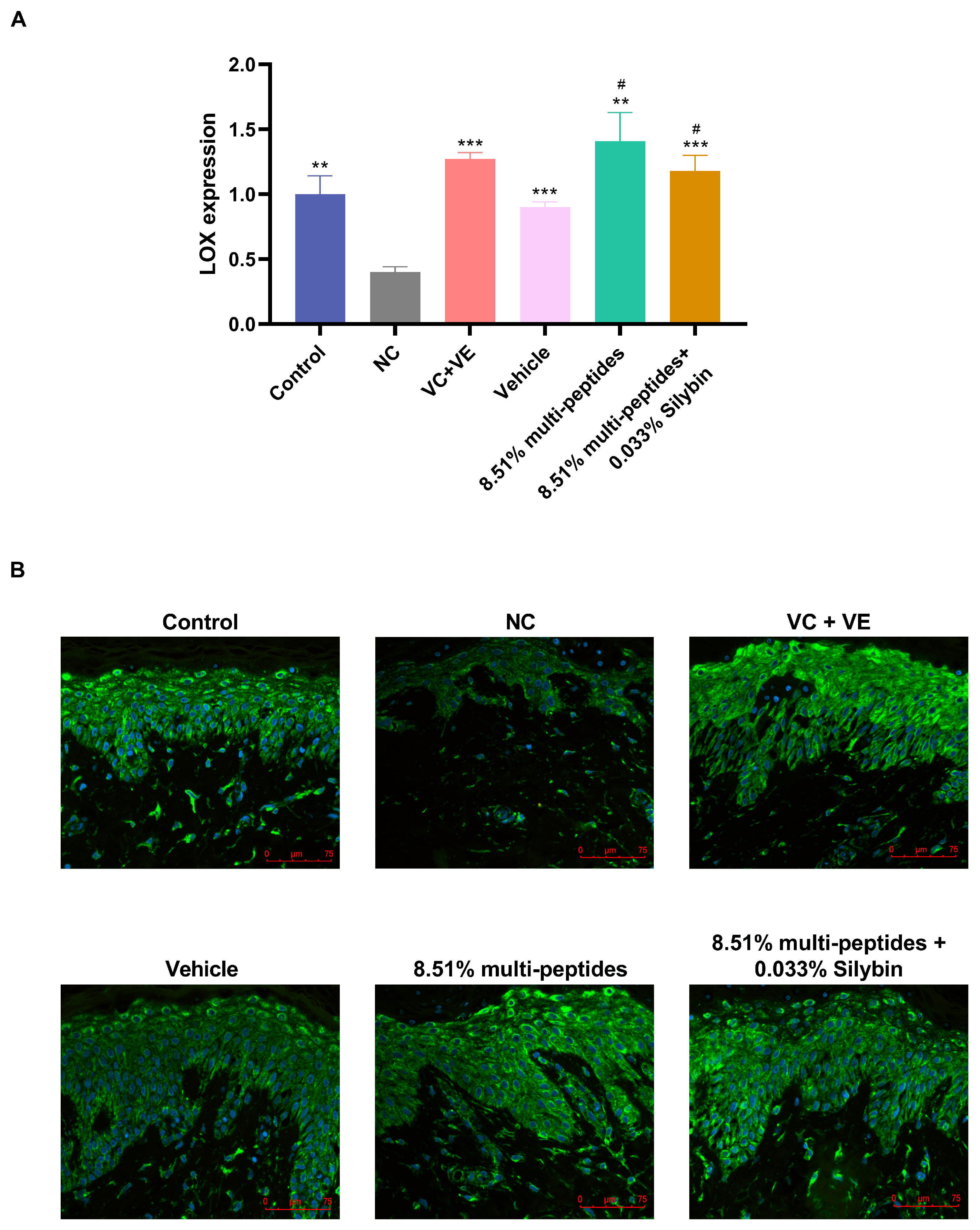 Figure 5. Effect of 8.51% multi-peptides and 8.51% multi-peptides + 0.033% silybin on UV-induced reduction of LOX in human skin explants. (A) Semiquantitative analysis of LOX expression in different groups, with IOD used to represent the level of expression. (B) Representative IF images of LOX (green) and nucleus (blue, DAPI). Higher green fluorescence indicates higher LOX expression. Experimental groups: untreated group (control), UV-induced only (negative control, NC), positive control (VC + VE), minimalist formula (vehicle), 8.51% multi-peptides, and 8.51% multi-peptides + 0.033% silybin. Data are presented as mean ± SD (n = 3). Statistical analysis was performed using Student’s t-test in each group. Statistical significance: ** p < 0.01, *** p < 0.001 vs. NC; # p < 0.05 vs. vehicle.