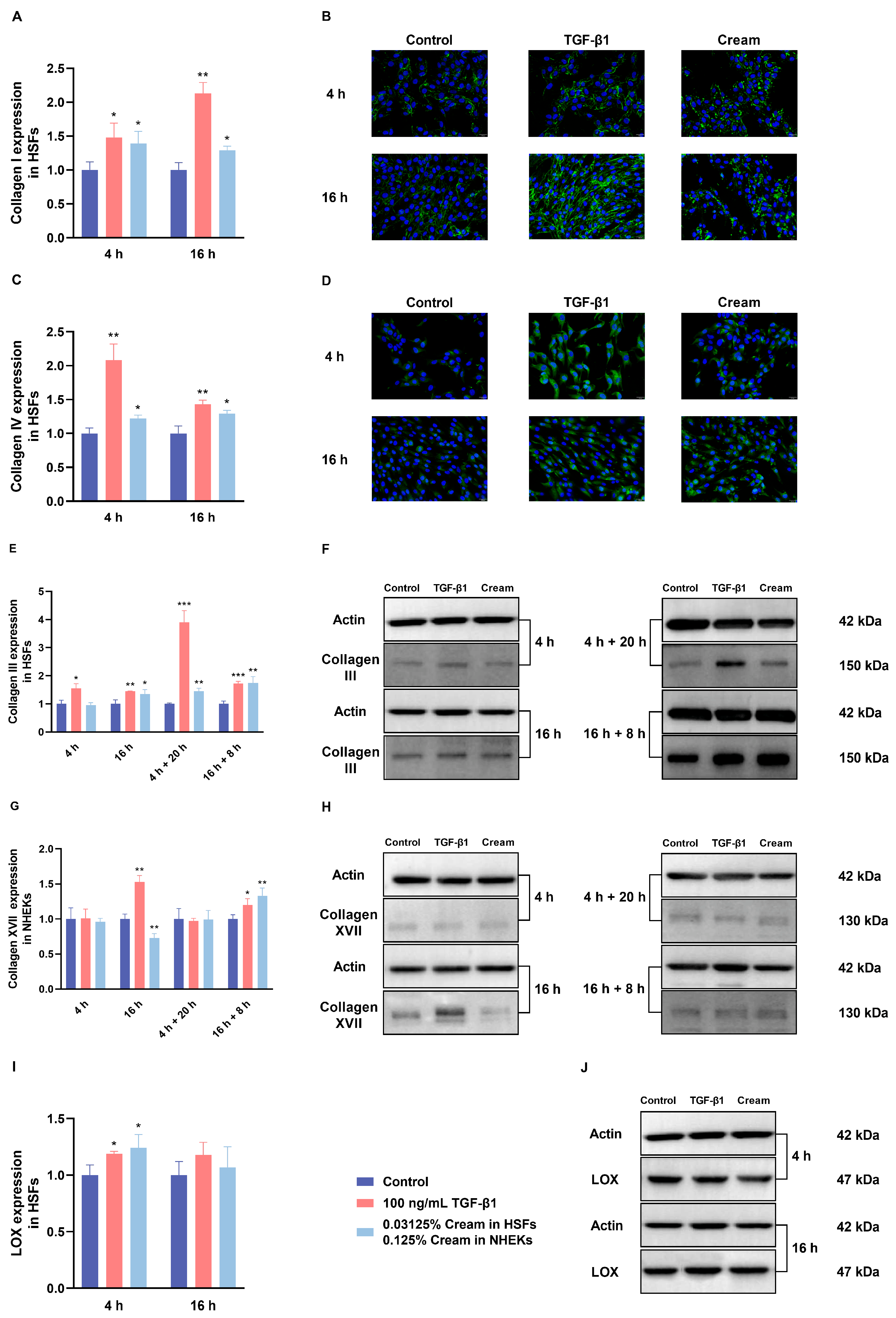 For the cream treatment (multi-peptides + silybin), early increases in collagen I, collagen IV, and LOX were observed as early as 4 h (p < 0.05 vs. control) and remained elevated at 16 h. Collagen III expression required extended incubation (4 h + 20 h, 16 h or 16 h + 8 h) to show significant upregulation, while collagen XVII enhancement was most marked after prolonged incubation beyond 16 h. IF images of collagen I and collagen IV (Figure 6A–D) revealed increased green fluorescence intensity in cream-treated cells, consistent with the semiquantitative results from Western blot (Figure 6E–J).
