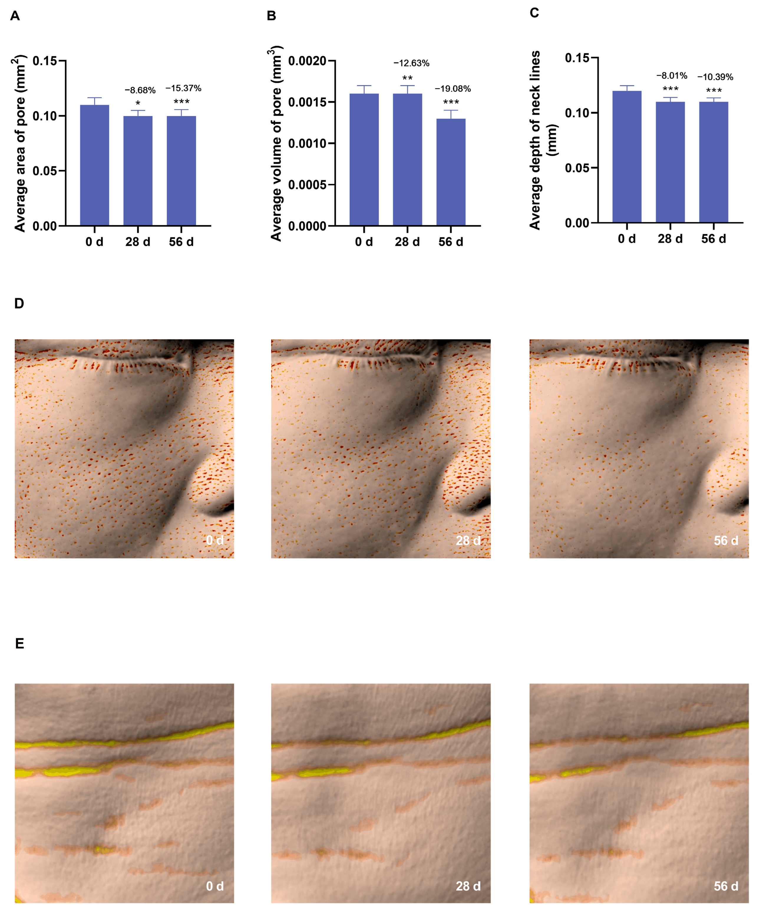 Figure 8. Improvement of pores and neck stripes after 28 and 56 days of clinical cream application. (A–C) Average area (mm2)/volume (mm3) of pore and average depth of neck stripe (mm) were measured by Antera 3D. (D,E) Images of pores and neck stripes acquired from Antera 3D. Data are presented as mean ± SE (n = 31). Statistical significance: * p < 0.05; ** p < 0.01; *** p < 0.001 vs. baseline (0 d). (D) Subject 1, 47 years old; (E) Subject 10, 53 years old.