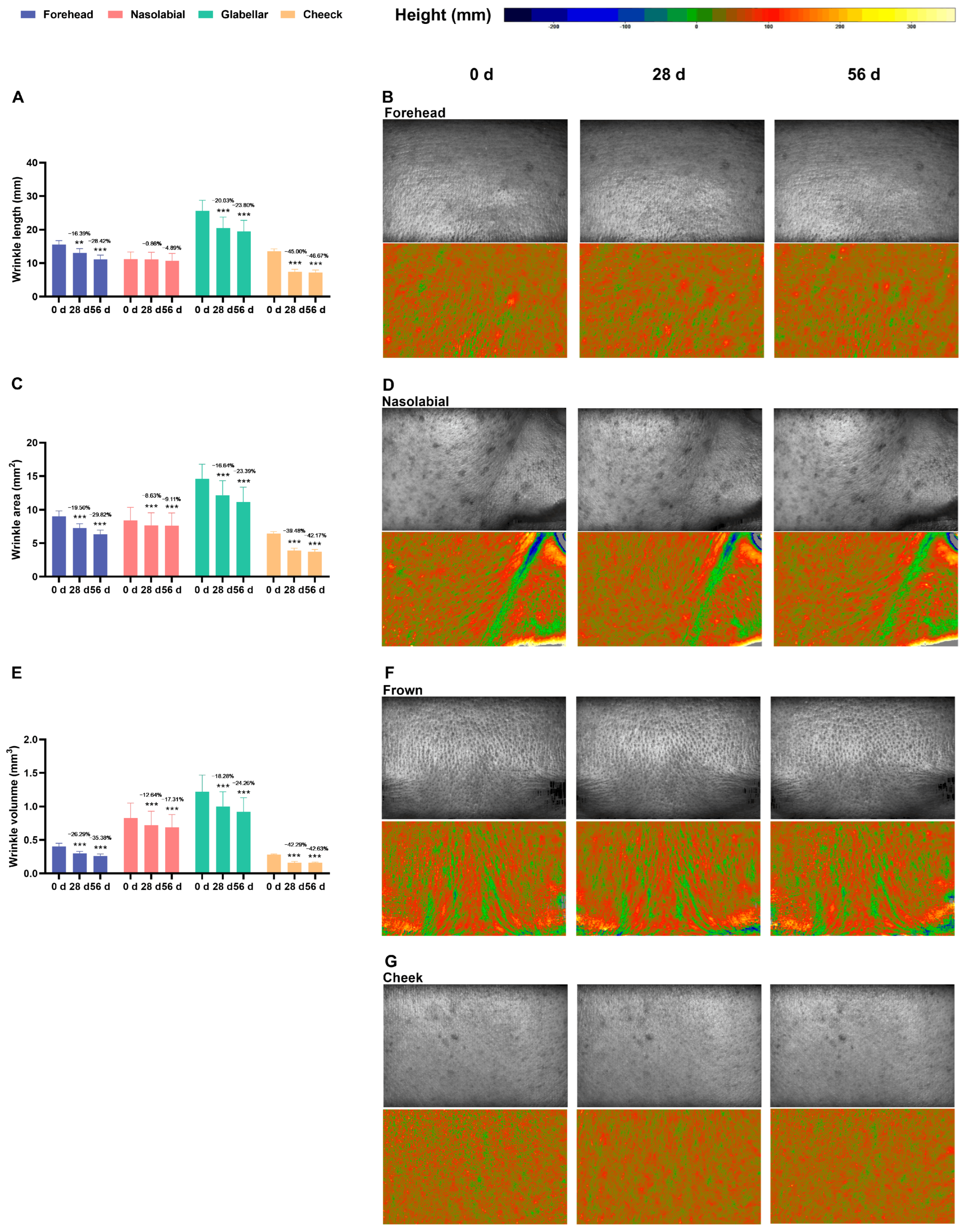Figure 9. Reduction of wrinkles in varying degrees after 28 and 56 days of clinical cream application. (A,C,E) represent wrinkle length (mm), area (mm2), and volume (mm3), respectively. (B,D,F,G) Grayscale and color height maps of forehead, nasolabial, frown, and cheek captured by Primos CR. The darker the color, the more sunken it was. Data were presented as mean ± SE (n = 31). Statistical significance: ** p < 0.01, *** p < 0.001 vs. baseline (0 d). (B) Subject 19, 42 years old; (D) Subject 15, 34 years old; (F) Subject 7, 54 years old; (G) Subject 26, 51 years old.