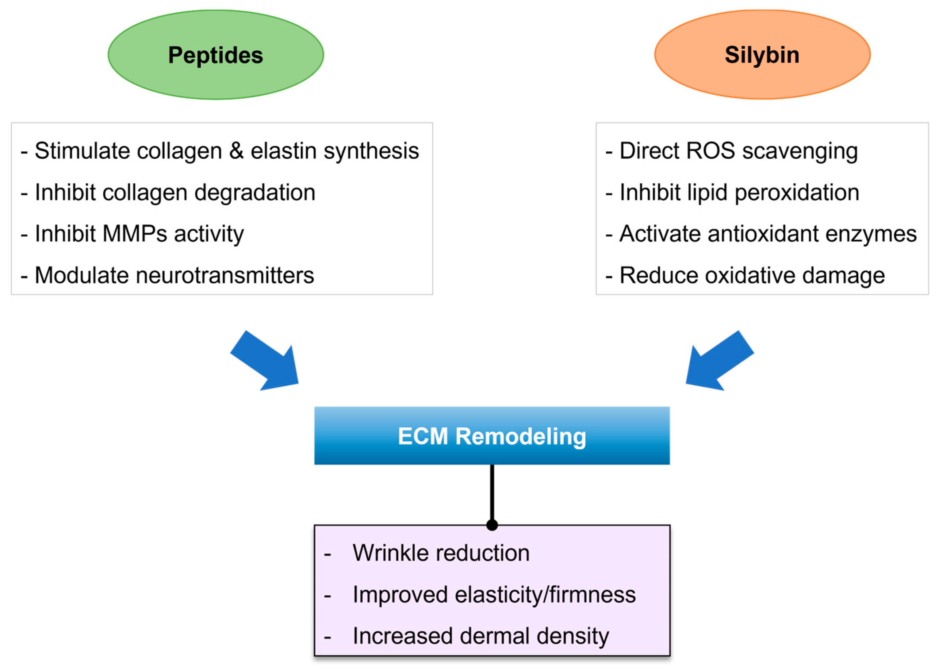 Peptides primarily improve structural wrinkles via dermal ECM support; however, they have limited effects on epidermal renewal and lack intrinsic free-radical–scavenging activity, which may constrain their standalone efficacy against photoaging-related oxidative stress [13]. Retinol—particularly when combined with antioxidants such as ferulic acid—has been shown to attenuate ROS levels and oxidative injury in UVB-induced photoaging models [26], thereby complementing the limitations of peptides and providing broader anti-aging benefits. In parallel, retinoid-like botanical antioxidants have gained attention as gentle yet effective anti-aging agents [27]. Silybin, a major flavonolignan isolated from Silybum marianum, has demonstrated notable antioxidant, anti-inflammatory, and photoprotective properties [28,29]. Treatment with silybin induced morphological changes analogous to those triggered by retinoic acid, inhibited the differentiation process of keratinocytes, reduced the expression levels of keratinocyte-specific terminal differentiation markers, and promoted the expression of proteins composing the basement membrane [29]. Silybin has been reported to exhibit superior anti-aging efficacy compared to the well-known retinoid-like compound, bakuchiol [30]. Unlike retinoids, however, silybin does not cause irritation or photosensitivity, making it an appealing “retinol-like” alternative for improving skin aging safely [29]. Recent clinical evidence supports silybin’s efficacy: a formulation with Silybum marianum extract was shown to increase collagen III and hyaluronic acid in human skin, producing anti-wrinkle results comparable to retinol but without the side effects [30]. Despite these benefits, silybin has been relatively underutilized in ECM-focused skincare studies, and its potential synergistic interactions with pro-collagen peptides are largely unexamined.