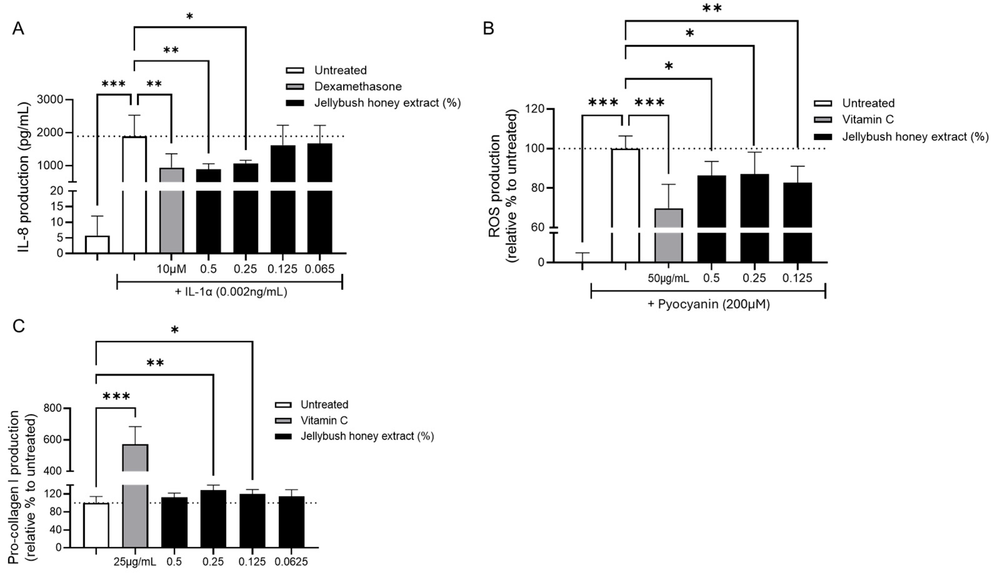 The anti-inflammatory potential of Jellybush honey extract was evaluated by measuring IL-8 production in IL-1α-stimulated NHDF cultures. As anticipated, IL-1α stimulation significantly increased IL-8 production. Notably, treatment with either 0.5% or 0.25% Jellybush honey extract significantly reduced IL-8 production, with efficacy comparable to dexamethasone (