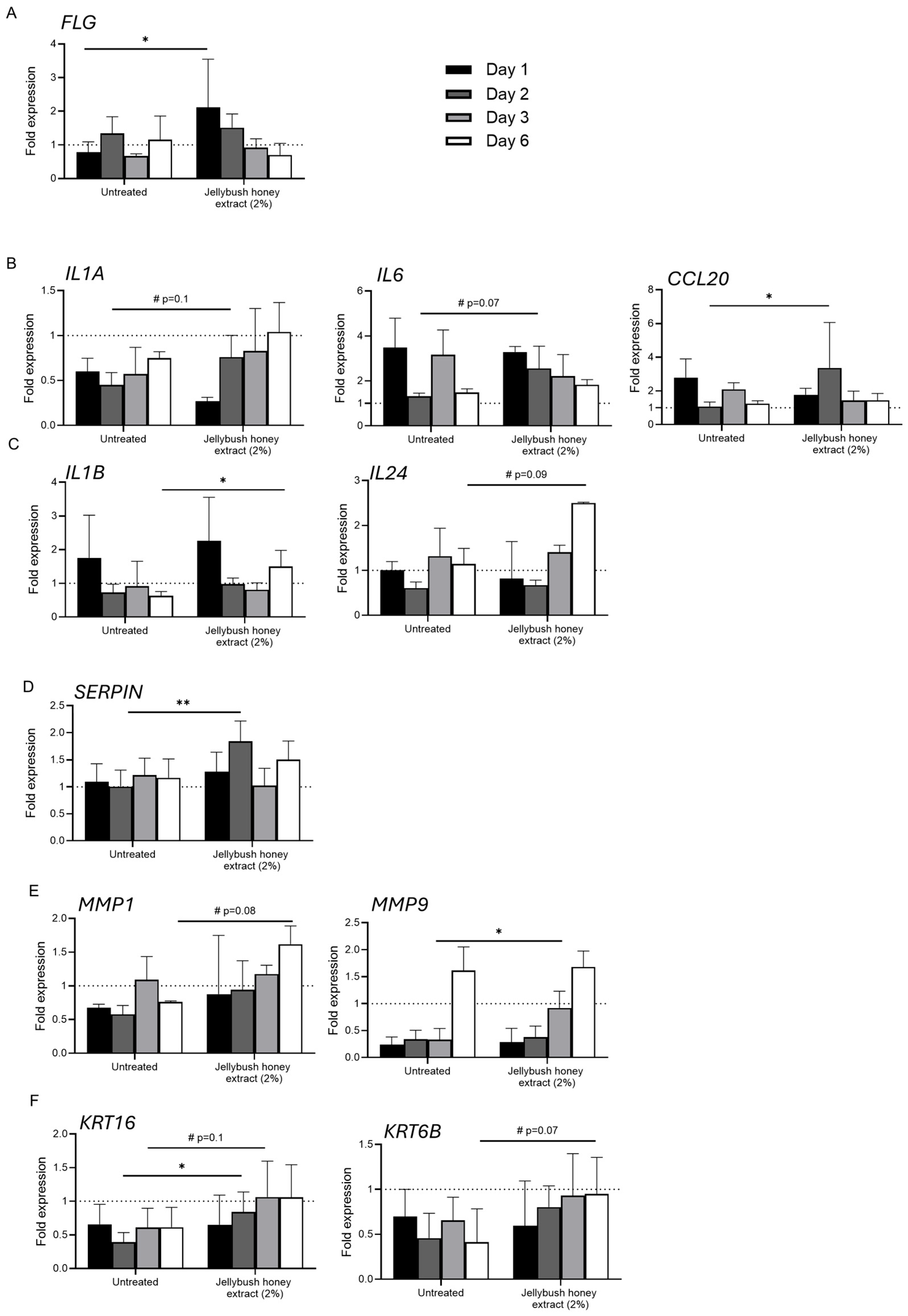 In addition to observing the formation of neo-epidermis, the wound healing process was monitored by gene expression analysis. Human skin explants were injured and treated with Jellybush honey extract. The cellular response linked to inflammation and matrix modulation was evaluated (