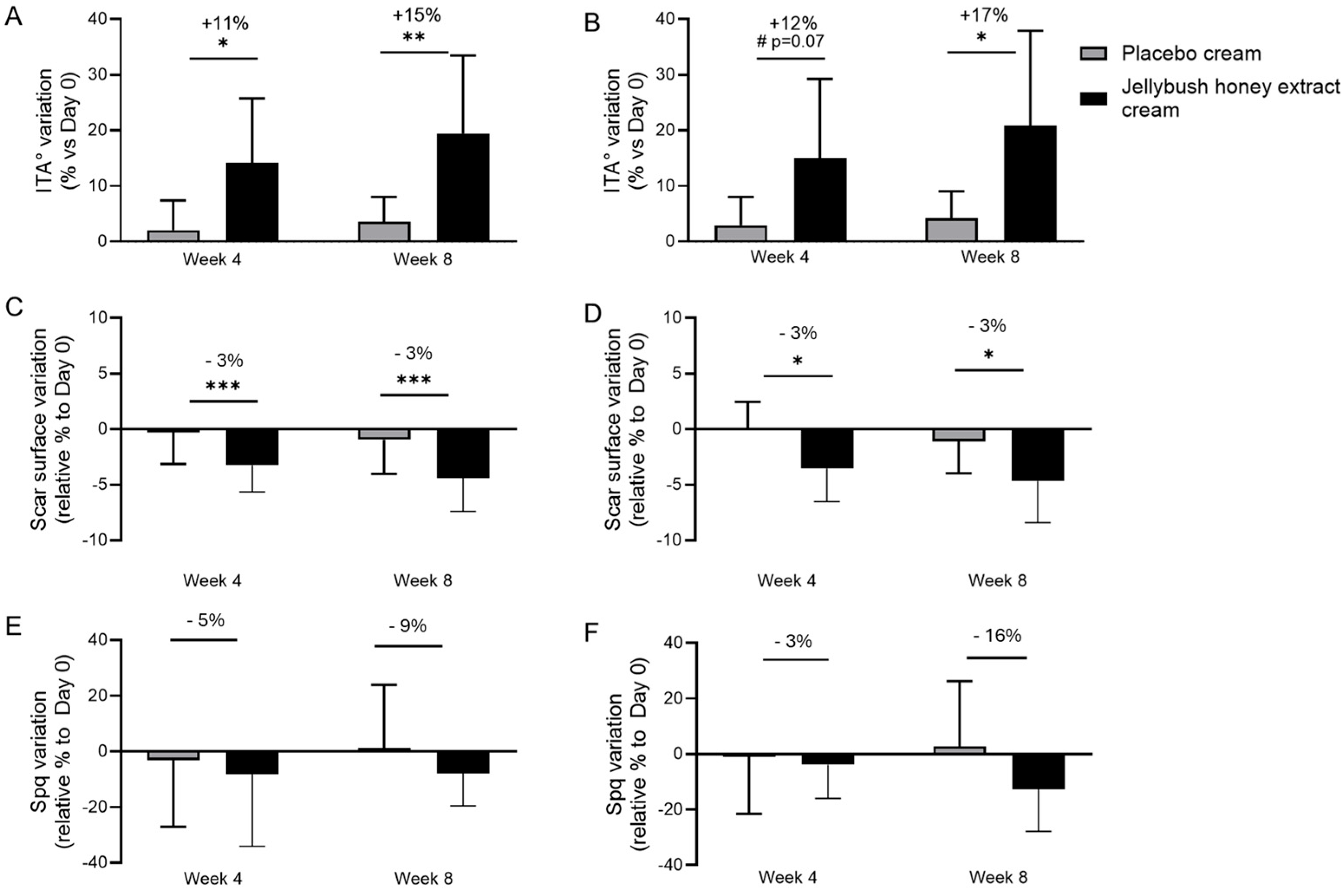 This improvement in skin homogeneity was associated with scar size reduction. Indeed, after 8 weeks of application, volunteers who applied Jellybush honey extract showed a significant decrease in skin area occupied by scars, with a 3% reduction across all volunteers and for volunteers with higher phototypes (