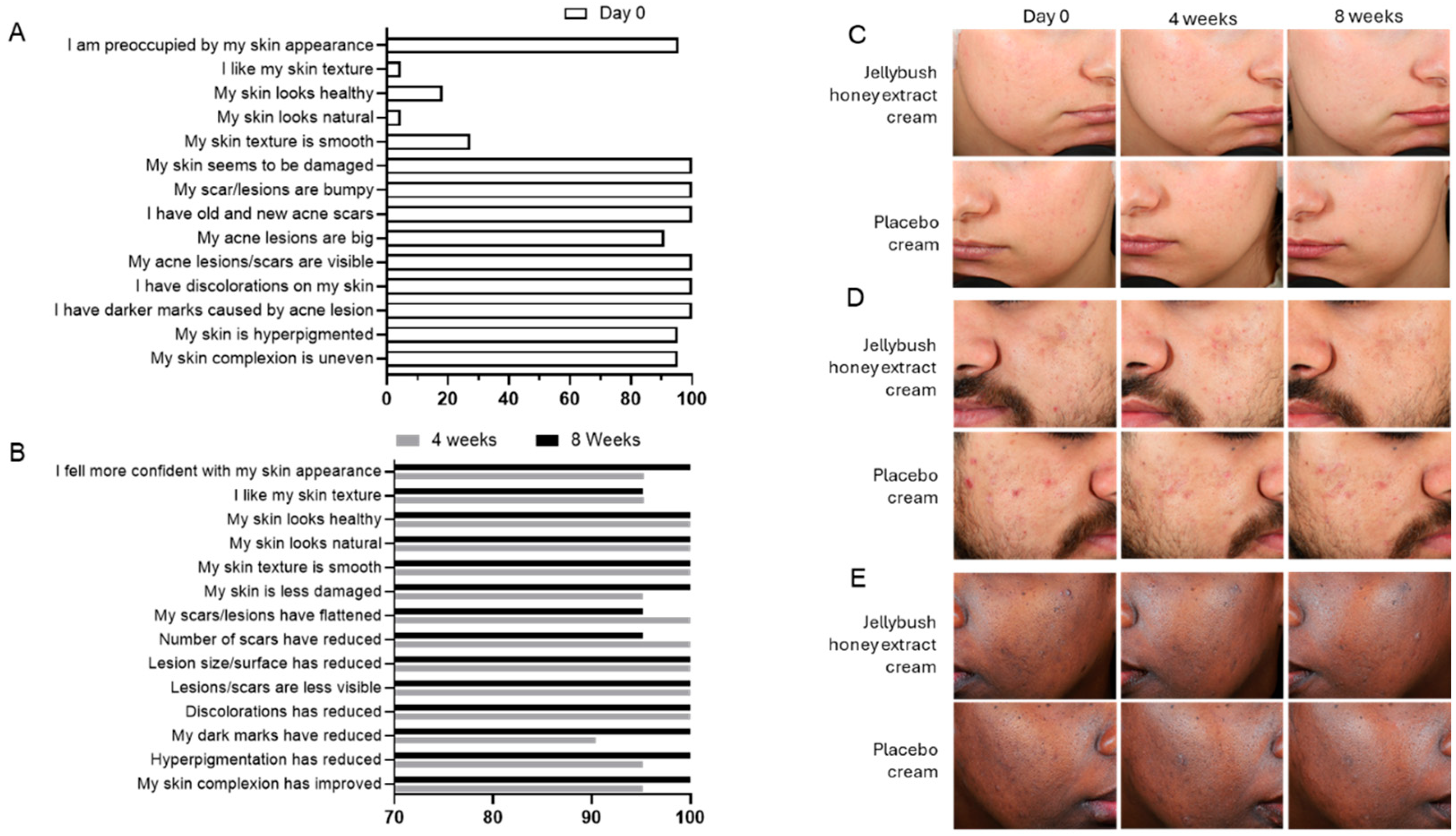 3.3. Clinical Efficacity of Jellybush Honey Extract in Scar Repair Across Diverse Skin Phototypes