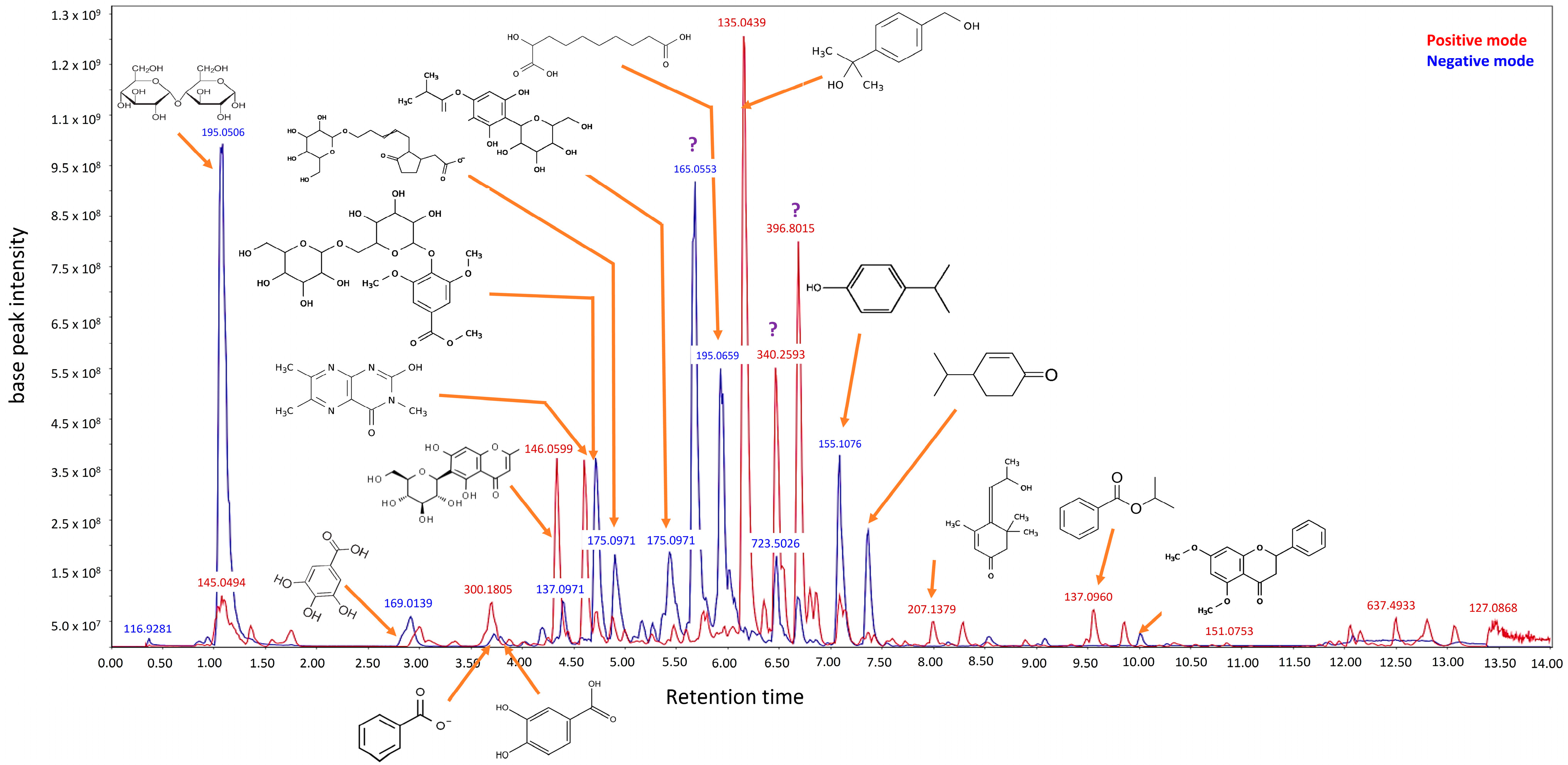 Scheme 1). This process eliminated major sugars and highly polar compounds, allowing us to concentrate on secondary metabolites. Our analysis revealed that the ingredient contains organic and phenolic acids and their derivatives, monoterpenoids, and carbohydrates.