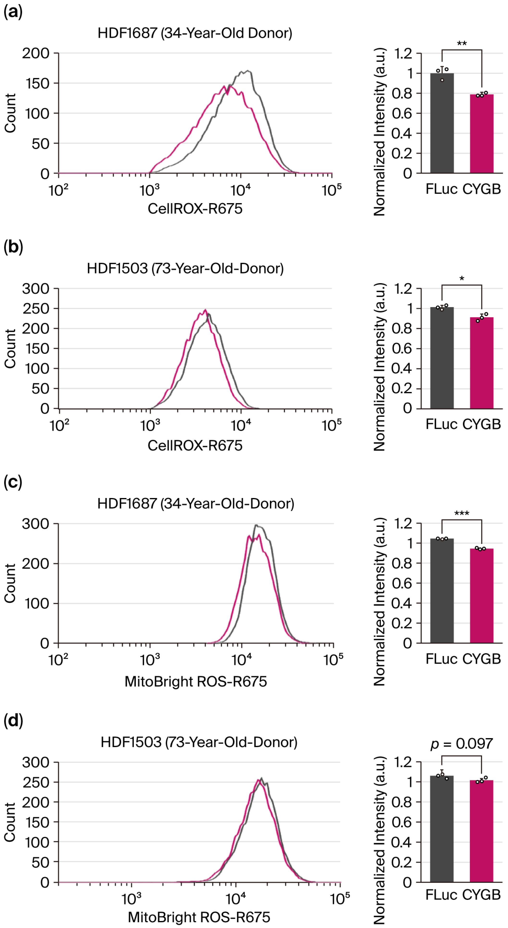 Figure 2a,b). We then tested whether CYGB could also contribute to quenching mitochondrial ROS utilizing the specific dye MitoBright ROS Deep Red. Notably, the transfection of CYGB mRNA reduced mitochondrial ROS levels in fibroblast cells from a 34-year-old donor; however, this effect was not significant in cells from a 73-year-old donor (