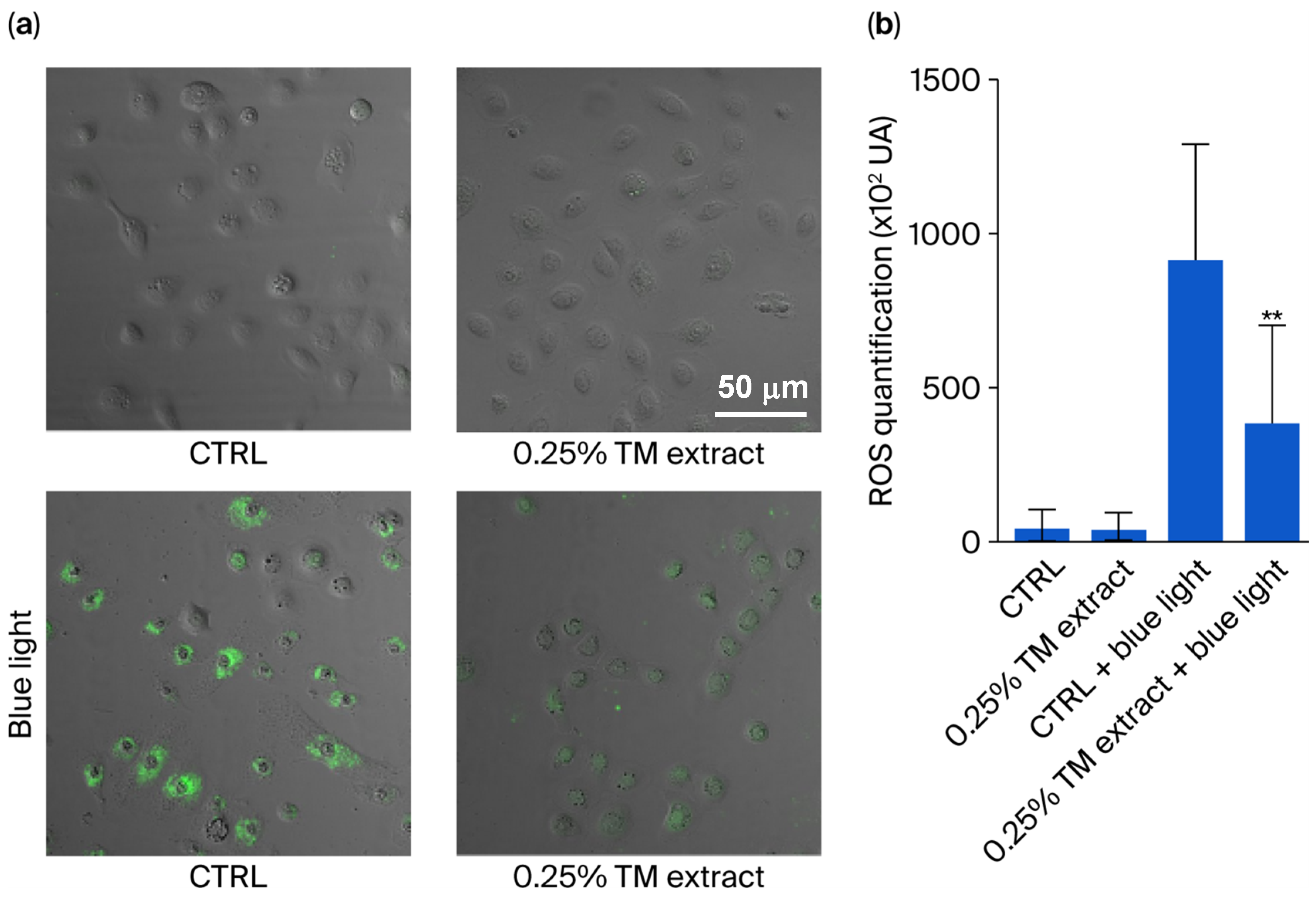 Figure 3). Then, control keratinocytes were exposed to blue light for 45 min, causing a significant 17-fold increase in ROS concentration. When these irradiated keratinocytes were treated with the extract after irradiation, ROS levels were decreased by 57% (