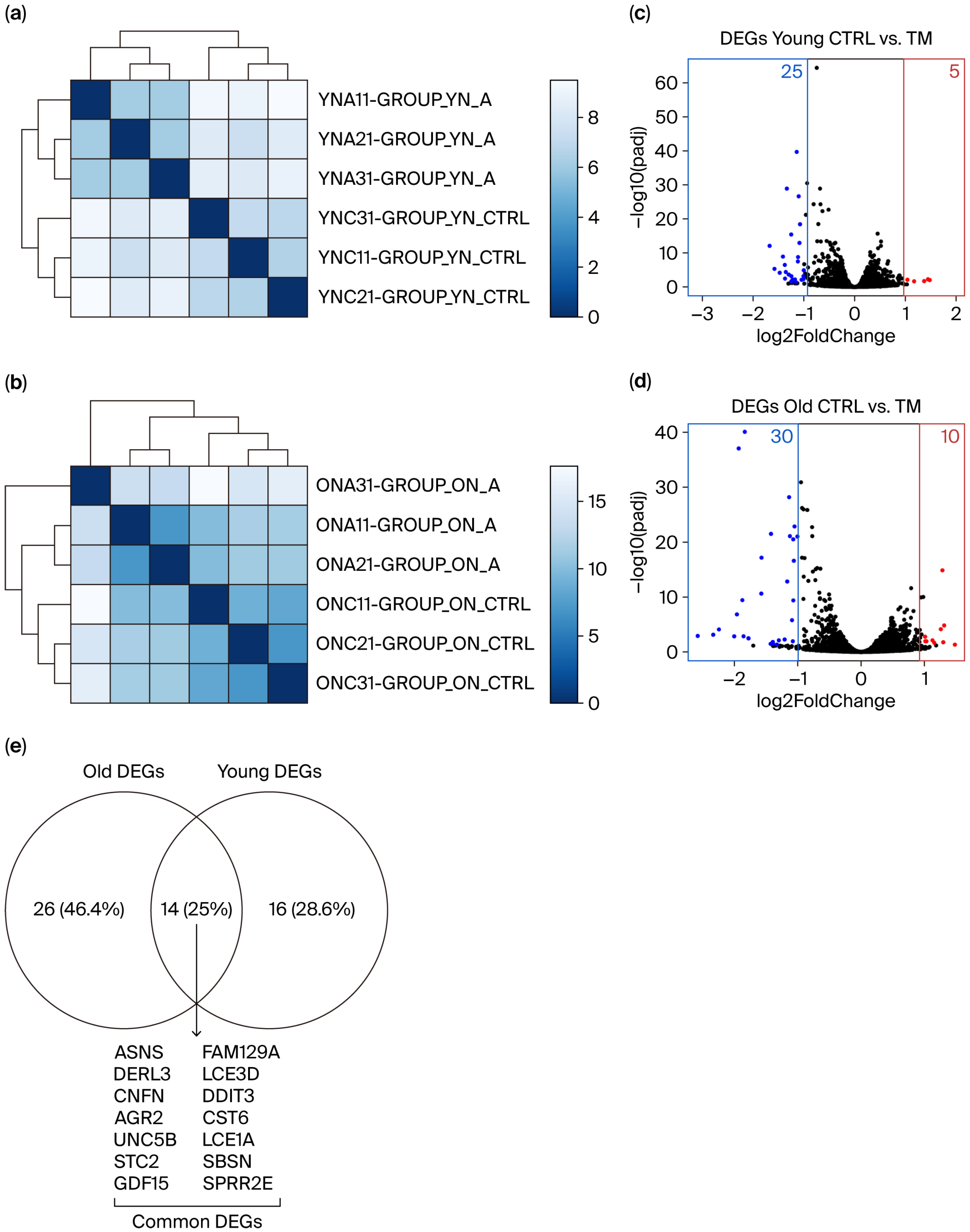 Figure 7d). Interestingly, a comparison of the DEGs from both age groups showed a 25% overlap, suggesting partially shared molecular responses to the treatment. Among the commonly regulated genes was