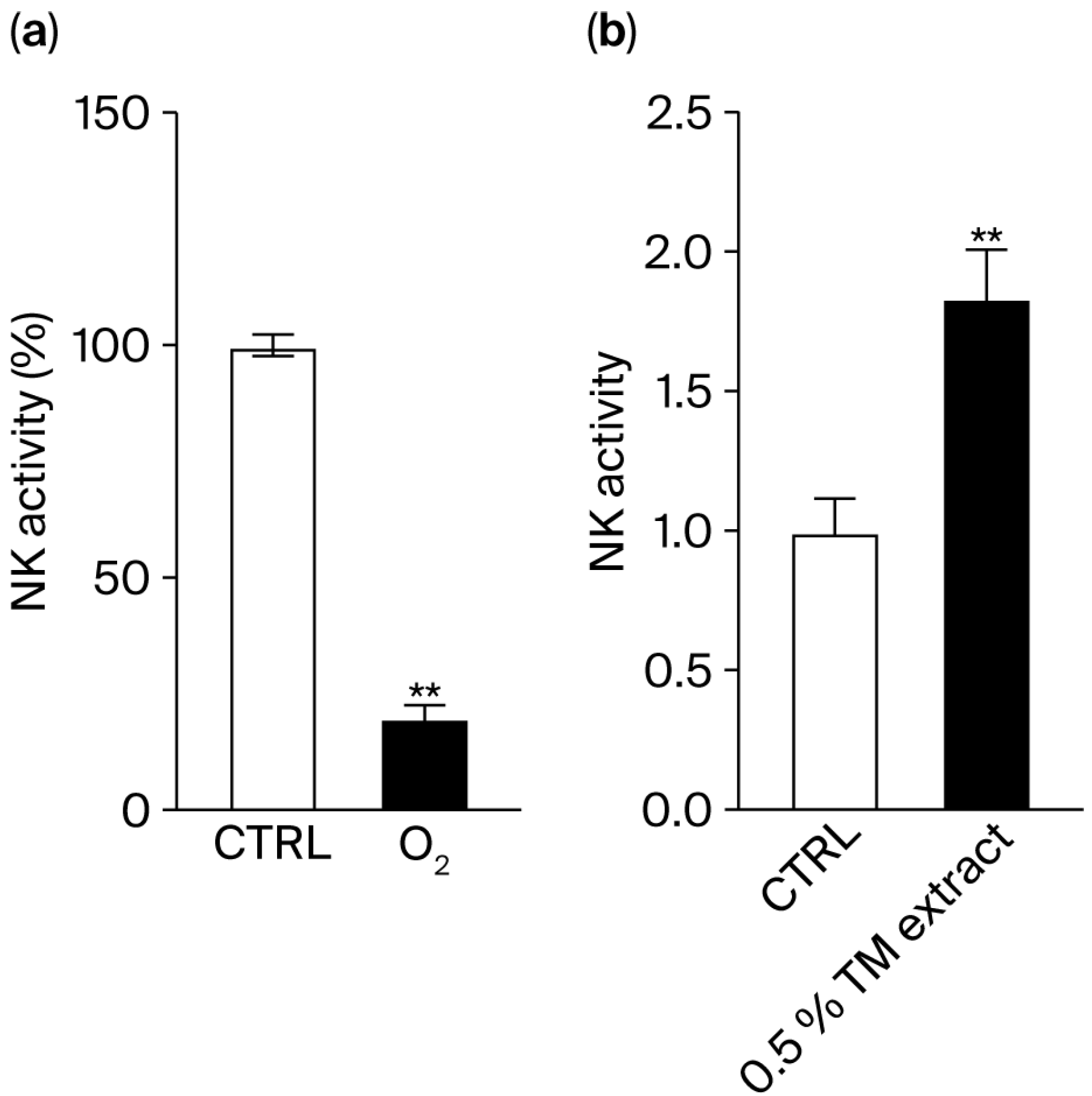 Figure 8a), indicating that oxygen is essential for natural killer (NK) cell function. Within tumors, hypoxic conditions limit NK cell activity, reducing their ability to kill cancer cells. Therefore, we hypothesized that a plant extract such as that of