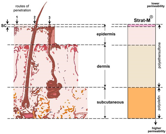 Regions of human skin versus Strat-M® membrane. Left (regions of human skin): upper layer epidermis with penetration pathways (1) stratum corneum (SC), (2) hair follicles, and (3) sweat glands; middle layer dermis; lower layer of subcutaneous adipose tissue. Right (Strat-M®) upper layer made of polyether sulfone with lower permeability; lower layer made of polyolefin with higher permeability [19].
