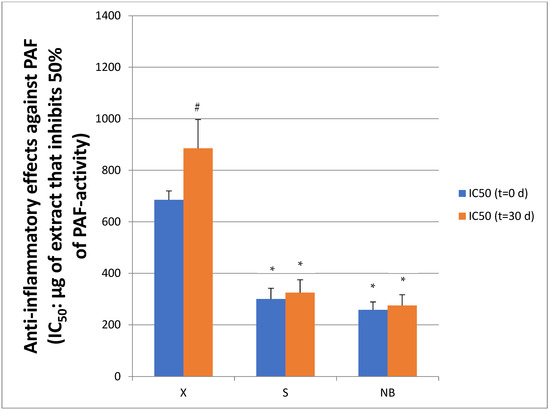 After one month of storage, the antioxidant capacity of cream X had a decreasing trend, probably due to increased lipid oxidation and the absence of additional antioxidant components. In contrast, cream S and NB showed a tendency to maintain and enhance their antioxidant activity, which may be attributed to the stabilizing effect of the natural extracts, as shown in previous studies for extracts from these fruits in cosmetic products [27,28,29]. Polyphenols and carotenoids probably slowed down the oxidative processes, contributing to the maintenance of the overall antioxidant capacity of the product, as also observed in other studies for such natural bioactives in cosmetic applications [32,33].