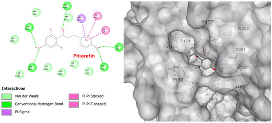 With respect to its molecular docking on PAFR, quercetin yielded the optimal score of −9.0 kcal/mol (Table 7), indicating that it has the strongest binding to the C1 binding site of PAFR, targeting the same active site as phloretin (6073 Å3 cavity). This obviously suggests that the two substituents compete with each other and, since they are both contained in the extract, they work together for greater and optimal inhibition of the most active region of PAFR. The observed better affinity of quercetin seems to be associated with its additional -OH groups, which increase hydrogen bonds with the receptor and thus improve affinity.