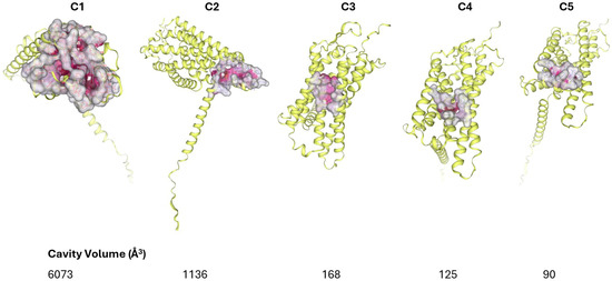 Molecular docking has emerged as a useful tool in the discovery and study of active substances, as it enables the rapid collection and prediction of interactions between the selected active substances under study and the target proteins [24]. The principle of CB-Dock2 software is based on calculating the curvature of the surface of the selected target protein to identify potential binding sites and then grouping the curvature data into clusters. The clusters constitute the candidate binding cavities. The cavities are then detected and classified. Usually, as in the present analysis, the 5 best clusters are selected and investigated for docking. Then, for each cavity, its geometric center and dimensions are calculated in order to cover it adequately without unnecessary space by adjusting the size of the docking box. After the ligand is introduced, docking is performed for all cavities, and the different binding positions (poses) are calculated, which are then re-ranked, and the optimal one is selected based on the binding affinity. Protein–ligand binding is widely used to predict the binding modes and affinities of ligands and to investigate and discover drugs using computers. The binding site is represented as a cubic box, which defines the boundaries of the sampling space. In most cases, the binding sites are unknown. While blind docking is less accurate than normal docking, it is valuable for discovering unexpected interactions in unrecognized binding modes. CB-Dock2 is an extremely useful tool, as it offers an interactive 3D visualization of blind docking and protein cavity scanning results and is available free of charge [25].