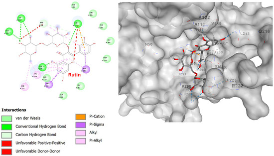 When a drug interacts deeply and penetrates inside a receptor, it acts as an orthosteric inhibitor, i.e., it effectively competes with the natural activator—PAF in this case—at its normal binding site, preventing its binding to a greater extent. Compared to allosteric drugs, orthosteric drugs bind to the active site, competing strongly with the natural substrate of the receptor and, if their affinity is high, successfully blocking the site. In fact, most commercially available drugs are orthosteric [57]. Rutin, despite its ability to form a sufficient network of hydrogen bonds, due to interfering interactions, had a lower vina score (−7.9), which is not disappointing.