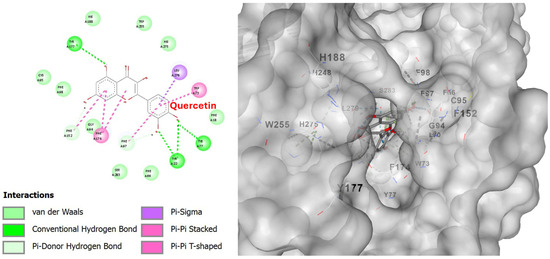Among the selected substances, quercetin was the one that presented the most optimal vina score (−9.0 kcal/mol), which is a very high value and strong binding affinity. This and kaempferol cover an internal and deep active center of the receptor, with various interactions.