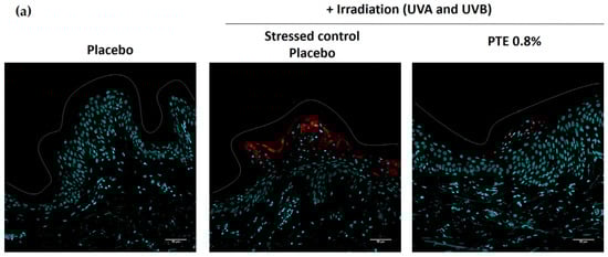 Human skin explants were obtained with the informed consent from breast and abdominoplasty surgeries (54 and 50 years old Caucasian female donors). The explants were cultured on biocompatible plastic grids into standard 24-well plates in an air–liquid interface with skin culture medium (Givaudan) 600 µL at 37 °C with 5% CO2. The culture medium (600 µL) was renewed every 24 h. Skin explants were topically treated with 20 µL PTE diluted at 0.8% in Miglyol 812® (IOI Oleochemical, Marl, Germany) or with Miglyol 812® only, as vehicle control. After 3 days of incubation, the skin explants were rinsed in PBS twice with 600 µL and the medium was replaced by HBSS for UV irradiation as follows: irradiated at 4.5 J/cm2 of UVA (λ = 365 nm) and 0.15 J/cm2 of UVB (λ = 312 nm), and without. Then, the treatment was applied again for 24 h after a second irradiation at the same dosages. Twenty-four hours after the second irradiation, the skin explants’ surfaces were rinsed with PBS, then frozen at −80 °C to be stored before further investigations.
