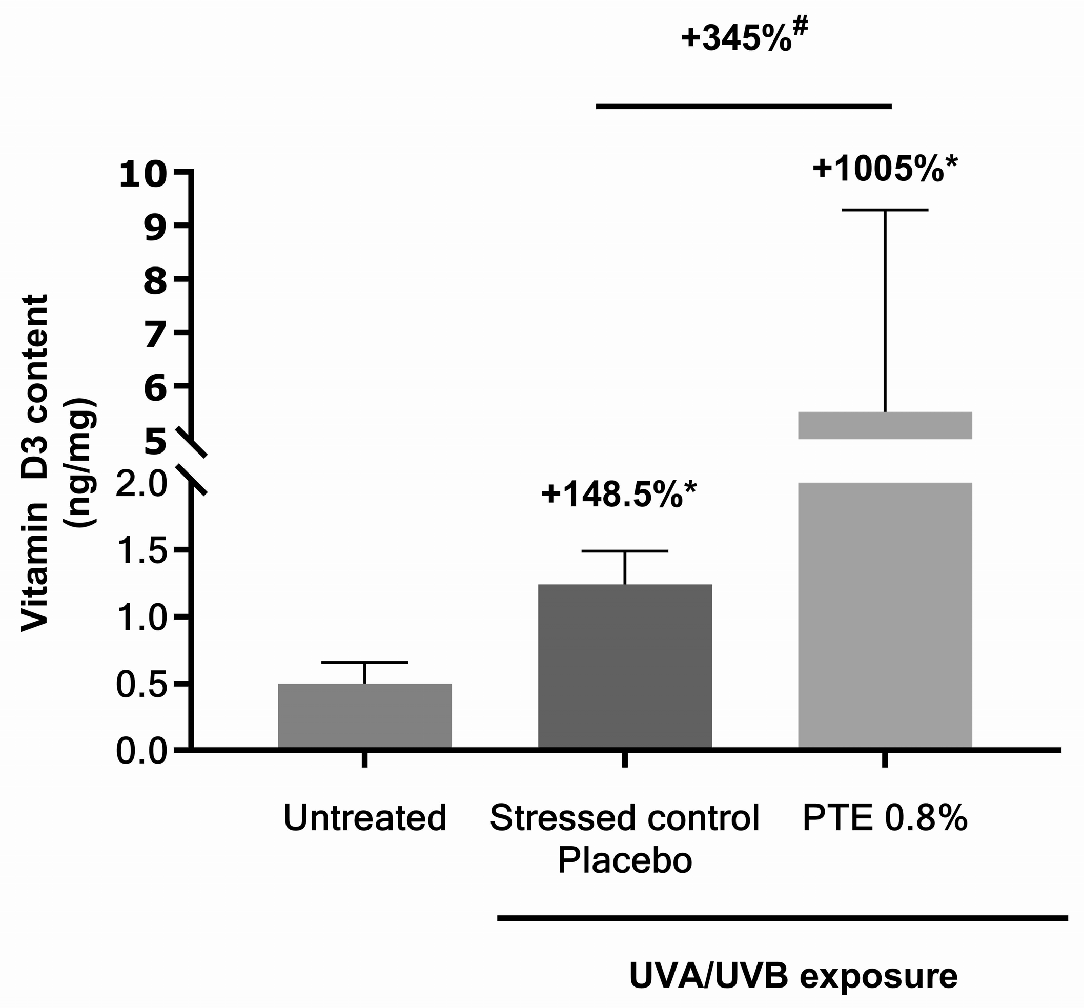 2.4. Quantification of Vitamin D3 in Skin Explants Treated with PTE and Under Moderate Daily UV Exposure