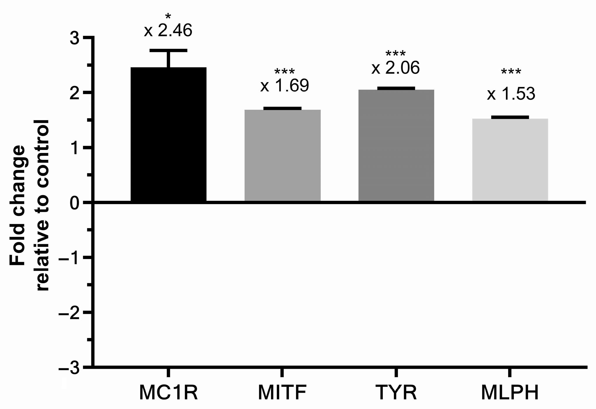 3.4.1. PTE Increases Expression of Genes Involved in Melanogenesis and Its Regulation