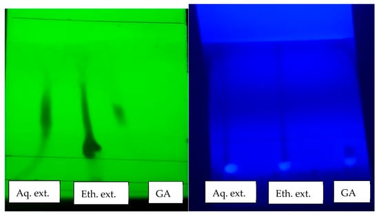 TLC was performed to confirm the presence of phenolic and flavonoid compounds in aqueous and ethanolic PPEs. Samples (10 µL of extract solution, 10 mg/mL) were spotted on silica gel 60 F254 plates (Merck) coated with 0.2 mm thick silica gel-G. Plates were developed using ethyl acetate: distilled water: formic acid (8:1:1, v/v/v) as the mobile phase. Spots were visualized under UV light at 254 nm and 365 nm and compared with standard reference compounds (gallic acid, quercetin, ellagic acid) [25]. (Figure 2).