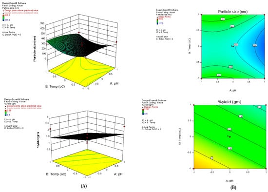 Box–Behnken design (Design-Expert version 13) was used to optimize the ZnOPPE-NPs. The particle size, PDI, and yield (g) was selected as dependent variables, and the concentration of ZnSO4·7H2O (% w/v), pH, and temperature (°C) as independent variables, based on the results of their preliminary study. The software generated 13 formulations which are presented in Table 1. In our BBD, pH (A) and temperature (B) exerted a negative effect on particle size and a positive effect on yield, while ZnSO4·7H2O concentration (C) showed the opposite trend—increasing size and reducing yield at higher levels. These effects are captured by the fitted linear and quadratic models (Equations (4) and (5)), with tight agreement between adjusted/predicted R2 and overall R2, supporting model adequacy. The response surfaces and contour plots (Figure 3A,B locate a well-defined optimum that minimizes size while maintaining acceptable yield. Guided by these surfaces, we selected pH 10/60 °C/5.75% w/v ZnSO4·7H2O for preparative batches, which consistently produced ~194 nm particles with PDI ≈ 0.33 and ζ ≈ −18.2 mV. This optimization strategy and factor-directionality agree with prior green ZnO optimization using response-surface methods, which similarly report alkaline pH and moderate temperature as size-reducing and yield-enhancing, and higher precursor strength as size-increasing due to aggregation/growth kinetics [28], and are consistent with peel-mediated systems reported for citrus/pomegranate matrices [21,26,29]. Among the 13 runs presented in Table 1, Run 4 (pH 10, 60 °C, 5.75% w/v ZnSO4·7H2O) represented the optimal condition, yielding nanoparticles of ~194 nm with acceptable PDI and yield. This run was therefore selected for preparative synthesis and further characterization. To determine the best-fit model, the data for each response was fitted into several experimental design models. Each response was plotted as a 3-D graph, displaying the independent variables’ graphical representation against the responses. Based on the BBD surface response analysis (pH 8–12, 30–90 °C, 4.75–6.75% w/v ZnSO4·7H2O), subsequent preparative syntheses employed the optimized condition pH 10/60 °C/5.75% w/v, which consistently yielded the smallest particle size with acceptable yield and colloidal stability [28]. Although zeta potential was measured to assess the colloidal stability of PPE–ZnO nanoparticles (ζ = −18.2 mV), this parameter was not included as a dependent variable in the Box–Behnken Design (BBD) optimization. The optimization focused on particle size, PDI, and yield, which are directly governed by process variables (pH, temperature, and precursor concentration). In contrast, zeta potential primarily depends on the intrinsic phytochemical composition of the peel extract (polyphenols, flavonoids, proteins), which cannot be systematically varied in the same manner. Therefore, ζ-potential was reported as a characterization parameter confirming moderate stability, rather than as an optimization response.