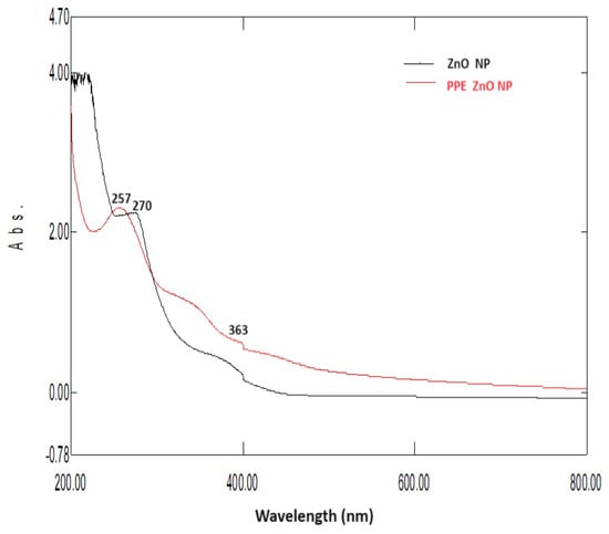 Data handling and interpretation: Spectra were evaluated for the characteristic near-band-edge absorption of ZnO in the 360–380 nm region (excitonic/band-gap transition), distinguishing it from higher-energy π→π* contributions of PPE capping molecules (~250–270 nm). For clarity, first-derivative traces were optionally computed to locate the band-edge inflection, and spectra from the chemical-route ZnO control were overlaid to confirm ZnO-specific features. All measurements were performed in triplicate (n = 3), and representative spectra are reported. The UV–Vis procedure was adapted from prior peel-mediated ZnO reports with minor adjustments to dispersion and dilution steps [29].