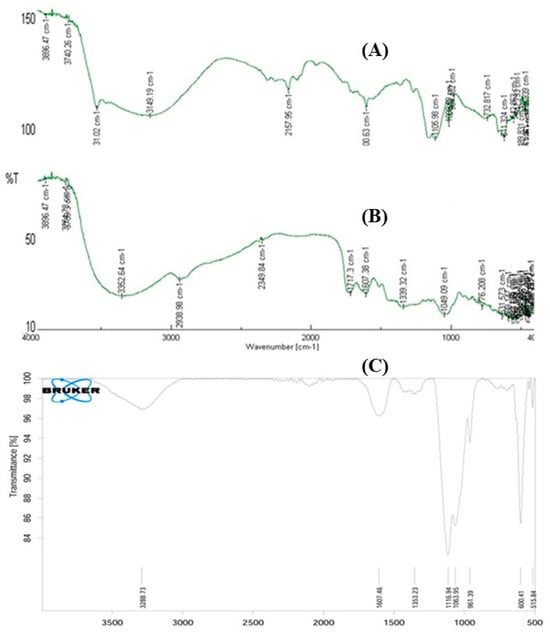 FTIR analysis was performed to molecular dispersion of extracts in nanoparticle synthesis. The technique enabled the identification of functional groups associated with compounds adsorbed on the nanoparticle surface, thereby providing molecular-level information. The spectra were noted to be in the range of 4000–400 cm−1. FTIR characterization of green-synthesized ZnO NPs followed the procedure reported by Shaban et al. (2022) [30].
