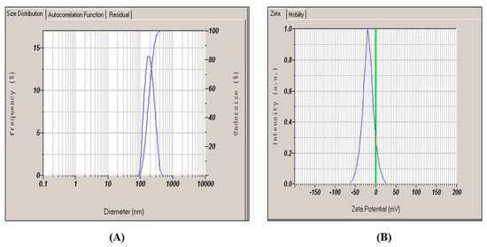 - Final synthesis conditions used for the main batches: Guided by the BBD study (Section Box–Behnken Design (BBD) Optimization), the optimized condition employed for preparative batches was pH 10, 60 °C, and 5.75% w/v ZnSO4·7H2O (≈0.20 M), yielding nanoparticles with ~194 nm hydrodynamic size, PDI 0.33, and ζ = −18.2 mV (see Section 2.5.7 and Section 3.2) [21,26,27,28,29].