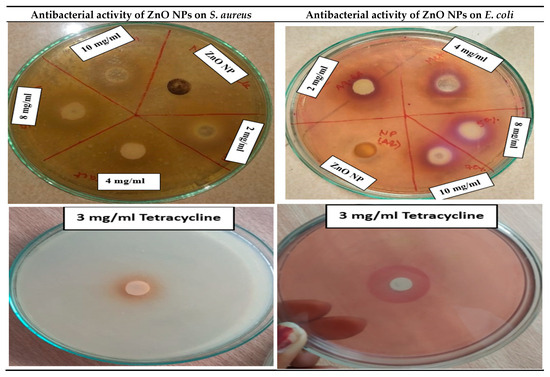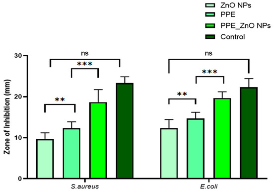 Antibacterial activity for obtained ZnO-PPE was evaluated using the pour plate method against Staphylococcus aureus, Escherichia coli. Sterilized nutrient agar medium was prepared, and the test samples were distributed using sterilized water. The bacterial cultures were mixed with molten sterilized nutrient agar and poured into Petri plates, which were allowed to solidify undisturbed. Wells of 10 mm diameter were created using a sterile borer, with each plate containing four wells: one for plant extract (100 μL of PPE) and three for ZnO nanoparticles at concentrations of 2, 4, and 8 mg/mL (100 μL each). The plates were left at room temperature for a few hours and subsequently incubated at 37 °C for 24 h. For benchmarking, wells containing ZnO (no-PPE control) and bulk ZnO were included at the same concentrations (2, 4, and 8 mg/mL) under identical conditions to compare uncapped and micronized references with PPE–ZnO NPs. Following incubation, diameter of the inhibition zones was performed following the protocol of Chamkouri et al. (2022) [34].