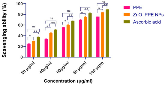 and IC50 values were obtained from concentration–response curves. References for the procedural basis are provided in [36,37]. In addition to PPE and PPE–ZnO NPs, ZnO (no-PPE control) and bulk ZnO were tested across the same concentration series; sample-matched blanks were recorded to correct any baseline scattering/absorbance.