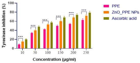 The aqueous extract of pomegranate peel (PPE) (10–200 µg/mL) exhibited tyrosinase inhibitory activity in dose-dependent style. Inhibitory effect for PPE–ZnO NPs was greater than that of PPE alone at all tested concentrations, but lower than that of ascorbic acid (80%). The enhanced activity can be attributed to bioactive compounds present in PPE, including gallic acid, ellagic acid, rutin, and quercetin, which are known tyrosinase inhibitors (Figure 15).