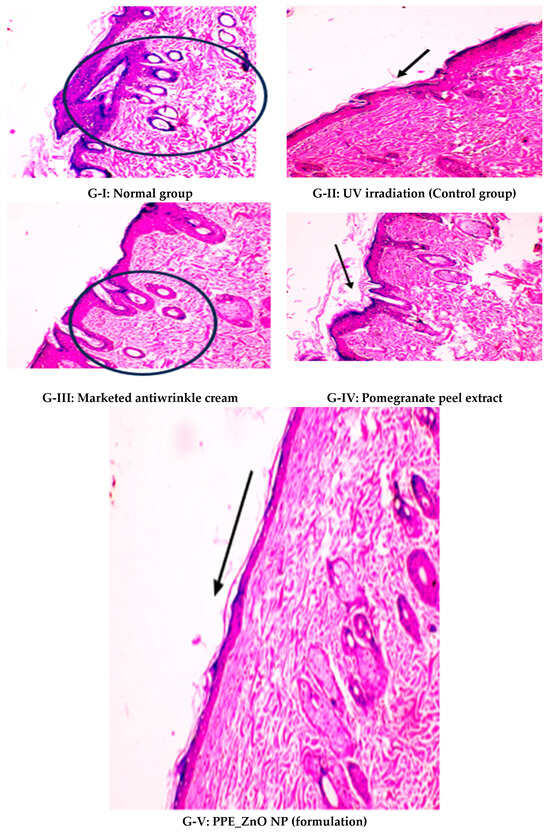 Histopathological examination of dorsal skin sections (H&E staining, 40× magnification) from different experimental groups: G-I: Normal skin showing intact epidermis and well-organized collagen fibers (circle). G-II: UV-irradiated control group showing marked epidermal hyperplasia, collagen degradation, and inflammatory cell infiltration (rarrow). G-III: Skin treated with marketed anti-wrinkle cream showing partial restoration of epidermal structure and moderate collagen organization (circle). G-IV: Skin treated with Punica granatum peel extract showing reduced epidermal thickening and improved dermal collagen arrangement (arrow). G-V: Skin treated with PPE–ZnO nanoparticle formulation showing near-normal epidermal architecture, dense collagen fiber regeneration, and minimal inflammatory infiltration (arrow). Arrows indicate key histopathological features such as epidermal thickness, collagen integrity, and dermal repair.
