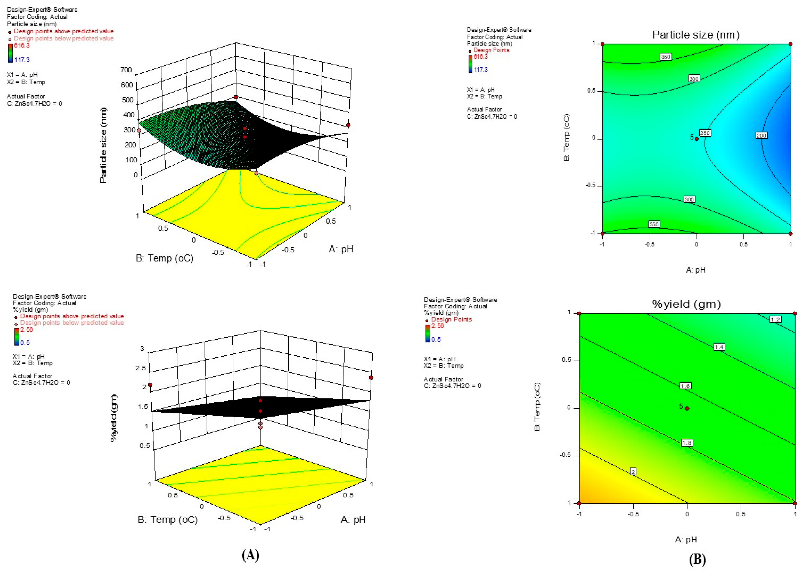 | X1 pH | X 2 Temperature (°C) | X3 ZnSO4·7H2O (% w/v) | Y1 Yield (g) | Y2 Size (nm) | |