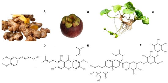 Plant materials used to prepare the polyherbal mixture and the targeted active compounds, which are used as biomarkers. (A): Zingiber cassumunar rhizome; (B): Garcinia mangostana fruit (fruit pericarp was used); (C): Centella asiatica whole plant (leaves were used); (D): (E)-4-(3′,4′-dimethoxyphenyl)but-3-en-1-ol (compound D); (E): α-mangostin; (F): asiaticoside.