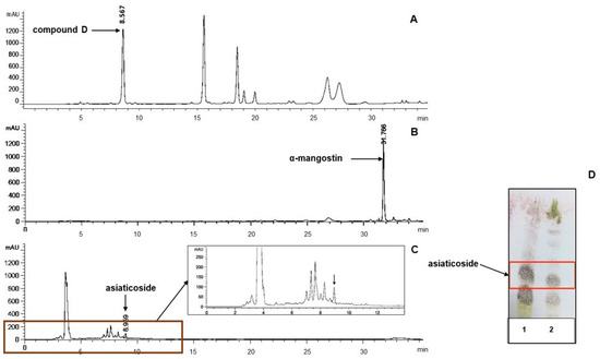 Chemical profiles of the selected extracts and their biomarkers. (A): Z. cassumunar extract (ZH); (B): G. mangostana extract (GE); (C): C. asiatica extract (CAEw); (D): TLC of C. asiatica extract (adsorbent: silica gel GF254; mobile phase: CHCl3:MeOH:H2O (30:13:1); detection: anisaldehyde–H2SO4 spraying reagent and heated; lane 1: BuOH layer; lane 2: CAEw).