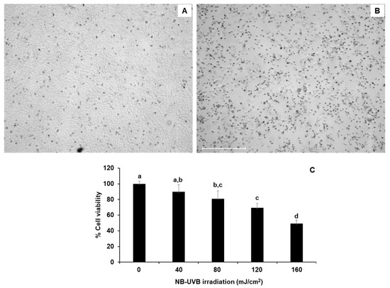 NB-UVB-exposed HaCaT cells and cell viability after 24 h irradiation. (A): non-irradiated HaCaT cells; (B): NB-UVB-exposed HaCaT cells at a dose of 120 mJ/cm2 after 24 h irradiation. Cells were visualized under an inverted microscope (10×).; (C): cell viability by NB-UVB irradiation in a dose-dependent manner after 24 h irradiation). (Different letters indicate significant differences between groups at p < 0.05 by Tukey’s multiple comparison test, n = 3).
