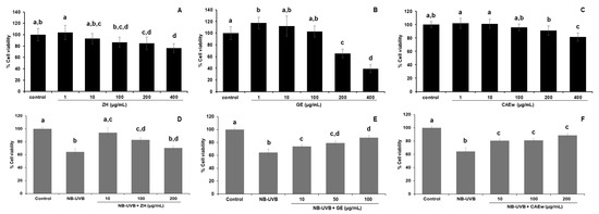 Effects of herbal extracts on HaCaT cell viability. (A–C): Cell viability of non-irradiated HaCaT cells. (D–F): Cell viability of NB-UVB-exposed HaCaT cells at a dose of 120 mJ/cm2. (Cells were treated following NB-UVB irradiation and incubated for 24 h). (A,D): Cells treated with ZH; (B,E): cells treated with GE; and (C,F): cells treated with CAEw after NB-UVB exposure. (Different letters indicate significant differences between groups at p < 0.05 by Tukey’s multiple comparison test, n = 3).