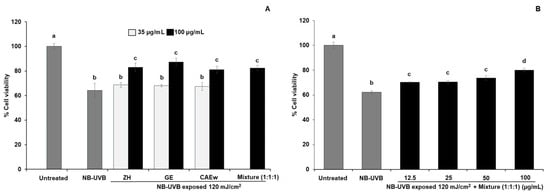 Effects of ZH, GE, and CAEw and the polyherbal mixture post-treatment on the cell viability of NB-UVB-exposed HaCaT cells. Cells were treated following NB-UVB irradiation and incubated for 24 h. (A): Effect of the single extracts at 35 and 100 µg/mL and the polyherbal mixture at 100 µg/mL. (B): Effect of the polyherbal mixture at various concentrations. (Data are presented as mean ± standard deviation (SD); different letters indicate significant differences between groups at p < 0.05 based on Tukey’s multiple comparison test, n = 3).