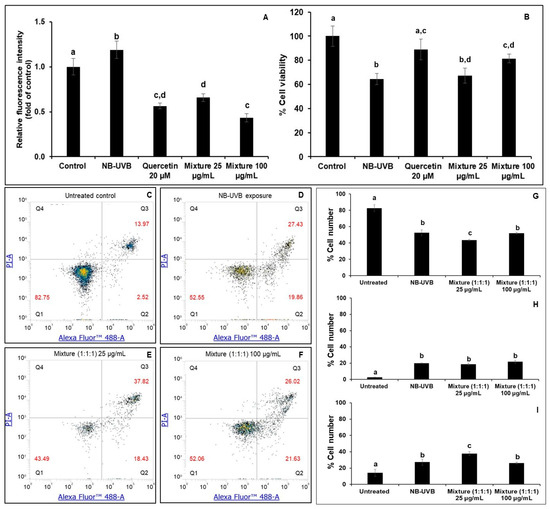 Effects of the polyherbal mixture (1:1:1) on cell viability, intracellular reactive oxygen species (ROS), and cell apoptosis in NB-UVB-exposed HaCaT. Cells were treated following NB-UVB irradiation and incubated for 24 h. (A): Intracellular reactive oxygen species (ROS); (B): effects of the 25 and 100 µg/mL mixtures on the cell viability of irradiated HaCaT cells; (C–F): scatter plots of PI (y-axis) vs. annexin V (x-axis) of cell apoptosis analysis using flow cytometry: (C): non-treated control (non-irradiation); (D): NB-UVB irradiation; (E): ZH:GE:CEAw (1:1:1) 25 µg/mL; (F): ZH:GE:CEAw (1:1:1) 100 µg/mL (Q1: viable cells; Q2: early apoptotic cells; Q3: late apoptotic cells; Q4: necrotic cells); (G–I): percentage of viable, early apoptotic, and late apoptotic cells ((G): viable cells; (H): early apoptotic; and (I): late apoptotic cells). Different letters indicate significant differences between groups at p < 0.05 based on Tukey’s multiple-comparison test.