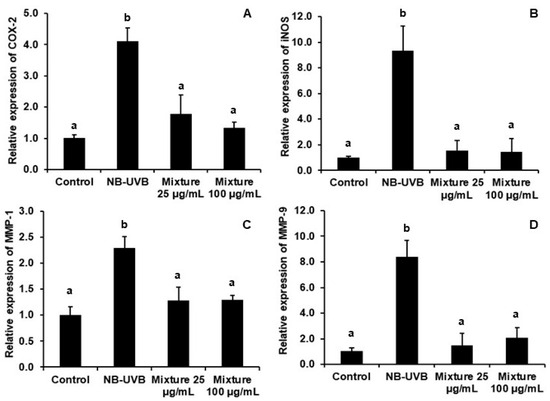 Effect of the polyherbal mixture on mRNA expression in NB-UVB-irradiated HaCaT cells. Cells were treated following NB-UVB irradiation and incubated for 24 h. (A): COX-2; (B): iNOS; (C): MMP-1; (D): MMP-9. The control was non-NB-UVB-exposed HaCaT cells. Data are presented as mean ± standard deviation (SD); different letters indicate significant differences between groups at p < 0.05 based on Tukey’s multiple-comparison test; n = 3.