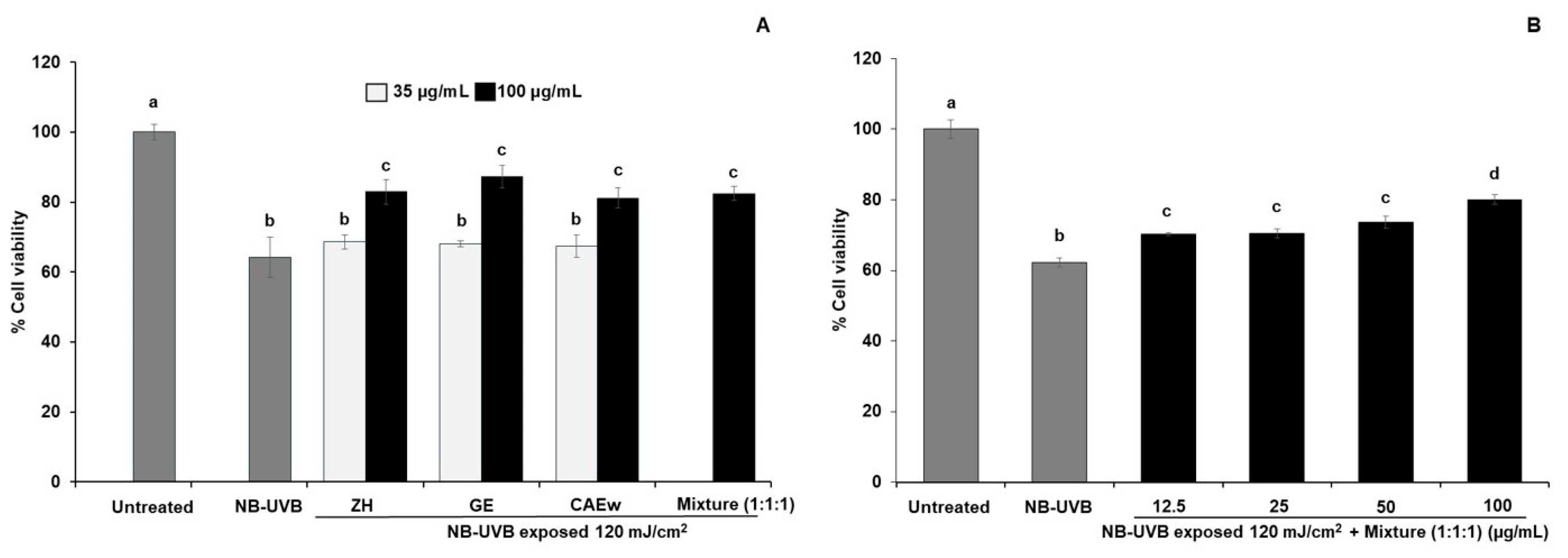 3.4. Effect of the Herbal Extracts on the Viability of NB-UVB-Exposed HaCaT