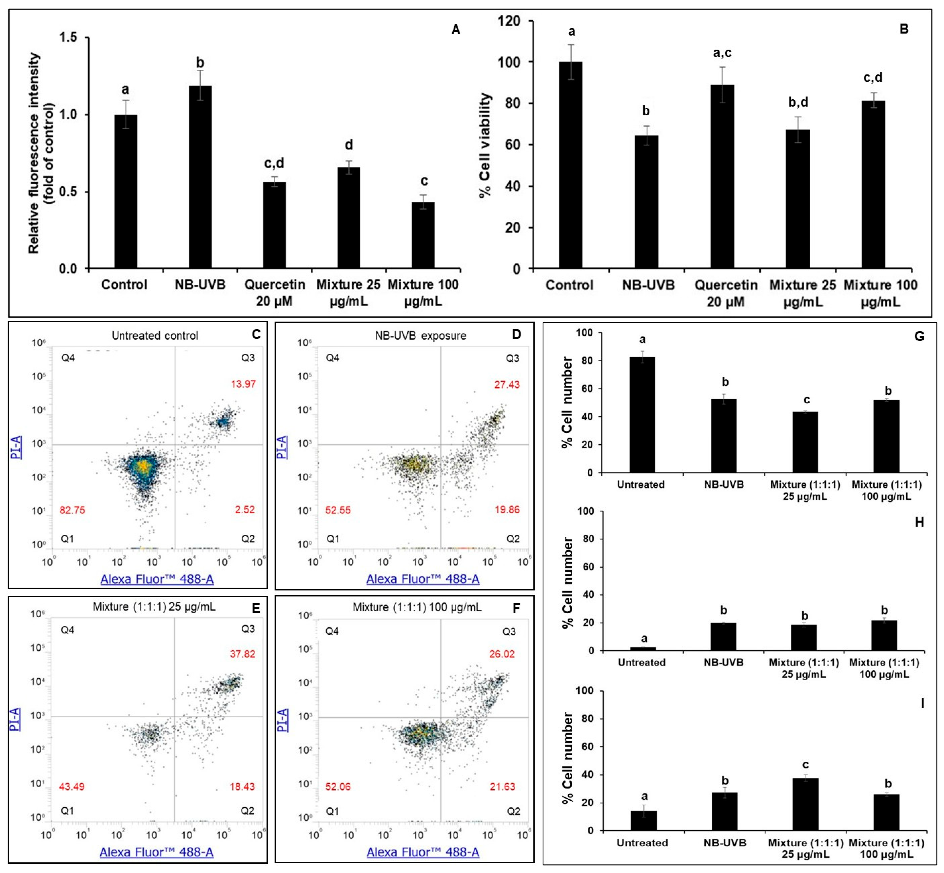 3.6. Effects of the Polyherbal Mixture on Intracellular Reactive Oxygen Species (ROS) and Cell Apoptosis on NB-UVB-Exposed HaCaT