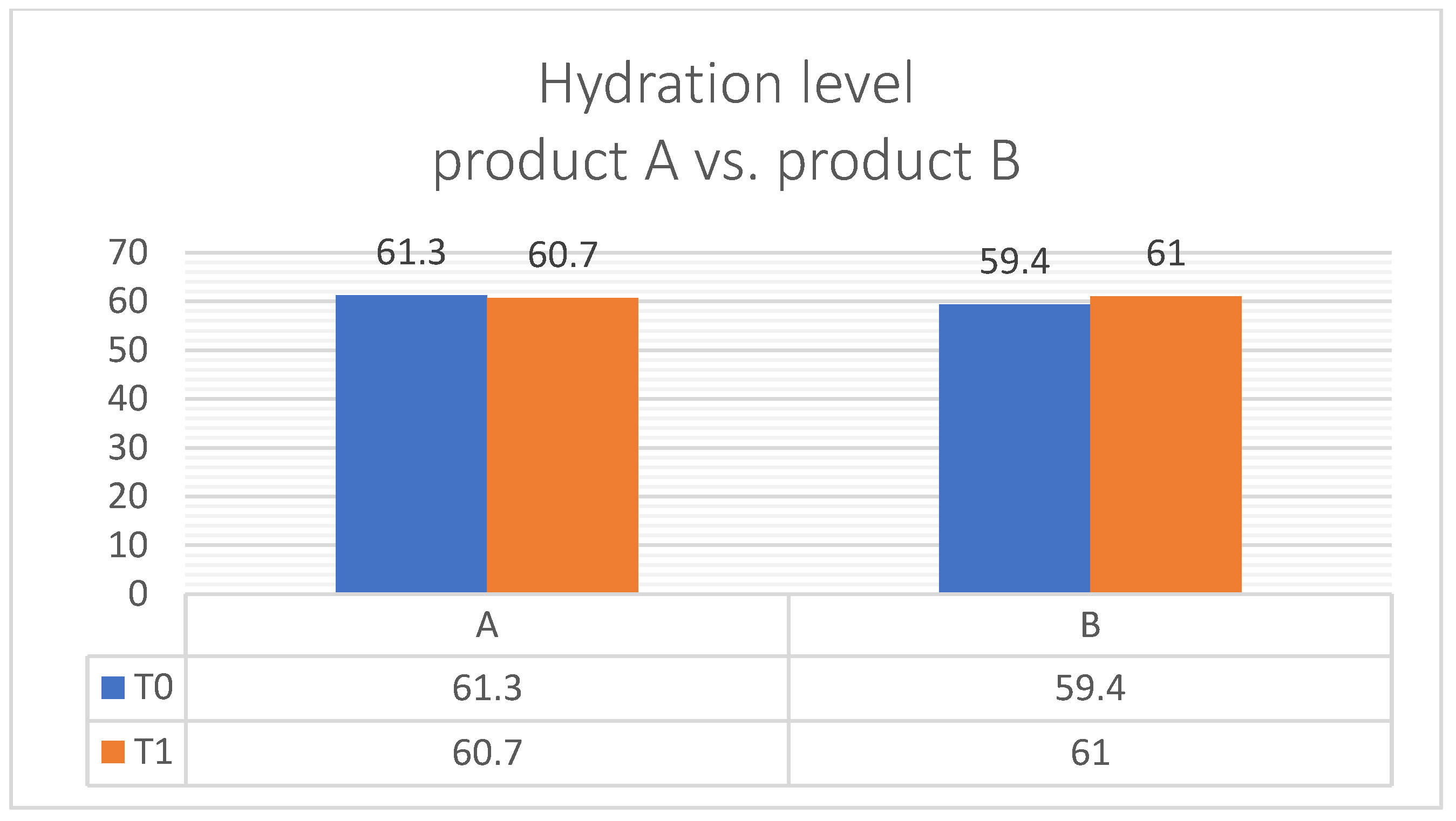 Hydration level of POLEVAN® vs. hyaluronic acid. A—POLEVAN®, B—hyaluronic acid.