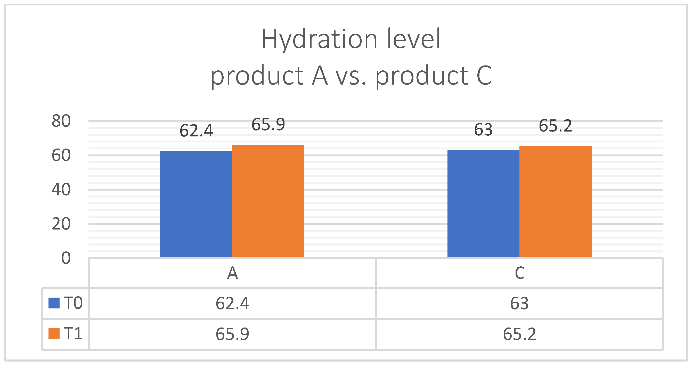 Hydration level of POLEVAN® vs. mix of POLEVAN® and hyaluronic acid. A—POLEVAN®, C—mix of POLEVAN® and hyaluronic acid.