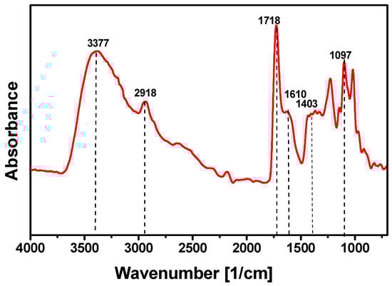 FTIR Spectrum of granadilla pectin shows the main functional groups. The broad band at 3377 cm−1 corresponds to –OH stretching vibrations from polysaccharide hydroxyl groups and absorbed water. Peaks at 2918 cm−1 and 1718 cm−1 are attributed to C–H stretching and ester (COOCH3) groups, respectively. Bands at 1610 cm−1 and 1403 cm−1 correspond to –OH and –COO− stretching, while signals between 1015 and 1100 cm−1 arise from C–O–C and C–O stretching vibrations of galacturonic acid units [47,49].