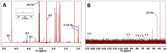 (A) 1H NMR and (B) 13C NMR of spectra of granadilla pectin. 1H NMR (A) shows characteristic D-galacturonic acid protons (H1–H4) and –OCH3 and –COCH3 signals, confirming methyl-esterified and acetylated structures. 13C NMR (B) displays typical D-GalA carbons (C1–C6) and a strong –OCH3 resonance at 57 ppm.