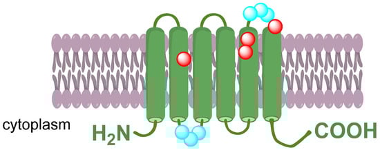 Aquaporins are tetramers, with each monomer forming a functional water channel independently. Furthermore, a central pore is formed in the homotetramer, facilitating the transport of liquids. Each monomer is composed of 6 α-helical transmembrane domains. Their polypeptide structure is formed by a single chain consisting of approximately 270–295 amino acids. Amino (N) and carboxyl (C) terminals are located in the cytoplasm and are responsible for the specific regulation of aquaporin activity. An asparagine–proline–alanine (NPA) motif is shared among all AQPs polypeptide chains and is believed to play a pivotal role in pore formation [14,15,16]. The aromatic/arginine selectivity filter region (ar/R) is located near the channel’s entrance. It functions as a crucial selectivity filter by physically restricting the channel entry. Additionally, the positive charge of the arginine residue repels positively charged ions (Figure 1) [17,18,19]