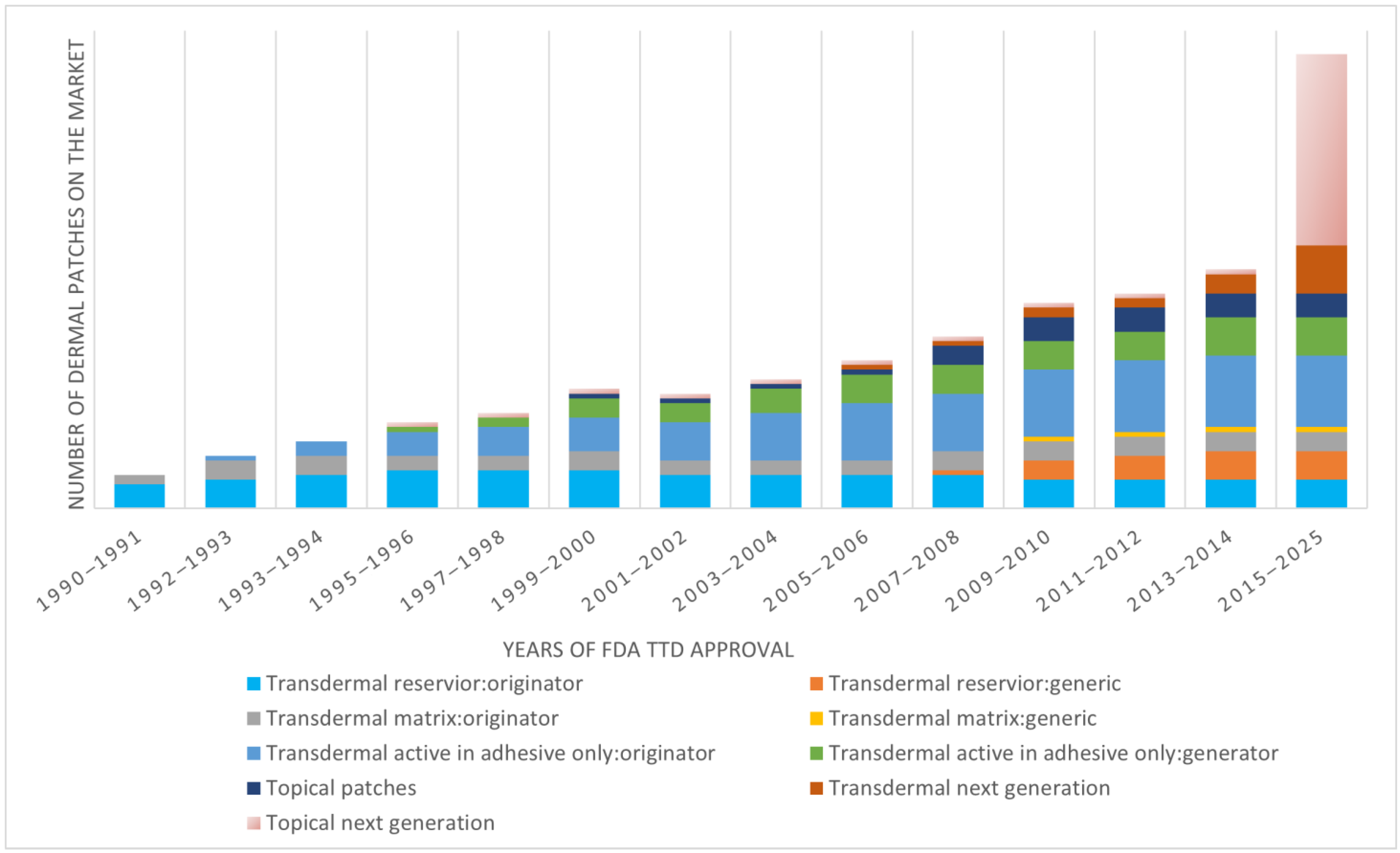 - Transdermal Skin Patches Market Size, Share & Trends Analysis Report by Type (Matrix, Reservoir, Drug-in-Adhesive), by Application (Pain Relief, Smoking Cessation, Hormone Replacement Therapy), by Region, and Segment Forecasts, 2024–2030; Grand View Research: San Francisco, CA, USA, 2024; Available online: https://www.grandviewresearch.com/industry-analysis/transdermal-skin-patches-market-report (accessed on 2 November 2025).
