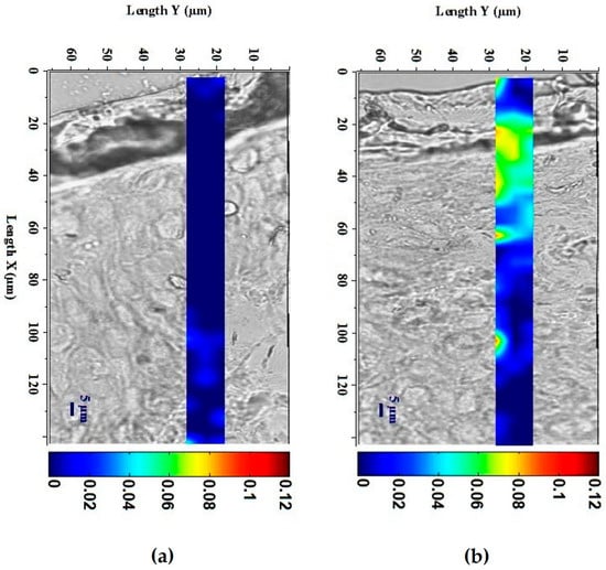 Confocal micro-imagery from Raman spectroscopy of ExLMW-HA permeation and localization in (a) untreated skin explants and (b) skin explants topically treated with ExLMW-HA at 30 mg/mL for 8 h. Color scale indicates relative amount of ExLMW-HA, from dark blue (low concentration) to dark red (high concentration).